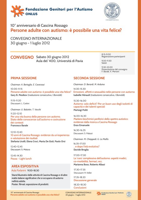 01/06/2012Di autismo nell’età adulta non si parla abbastanza. Ma ricordiamolo sempre: con tutta l’abilitazione di questo mondo un bambino autistico sarà un adulto autistico. Sta a noi offrirgli la vita migliore e più umana possibile. Tutto il programma qui.