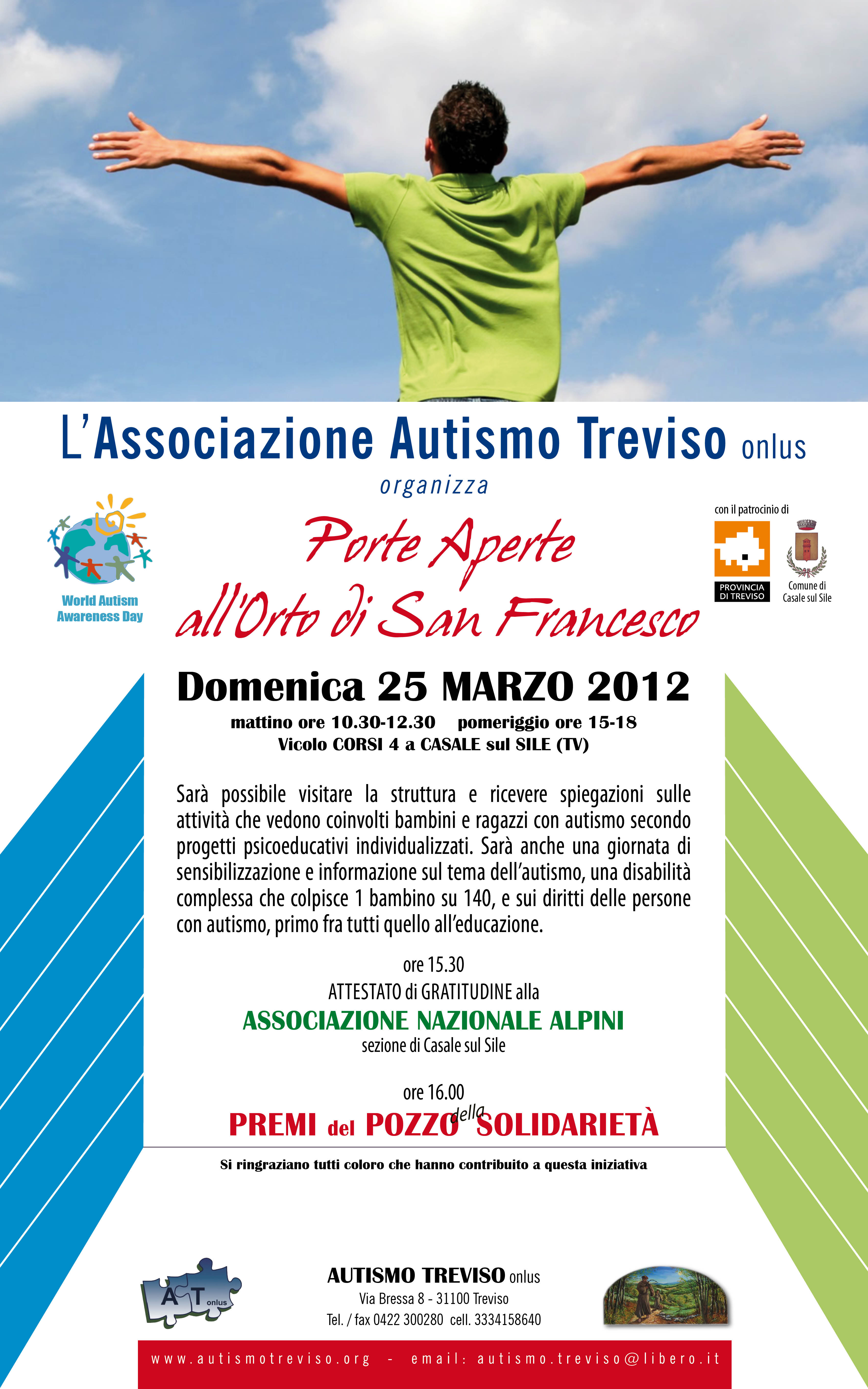 29/03/2012Porte Aperte: anzitutto alla conoscenza. Bisogna sapere che le persone con autismo sono tante. Bisogna sapere che per loro e per le loro famiglie finora si è fatto pochissimo. Bisogna sapere anzitutto quante sono, e dove sono! Provate a domandare ad un qualsiasi sindaco d’Italia se sa quante famiglie con un membro autistico ci siano nel suo comune. Quasi sicuramente vi dirà che non ha dati disponibili. Domenica 25 marzo all’Orto di San Francesco sono venuti in tanti, gente di ogni età e provenienza. L’autismo deve diventare una realtà percepibile sul territorio.