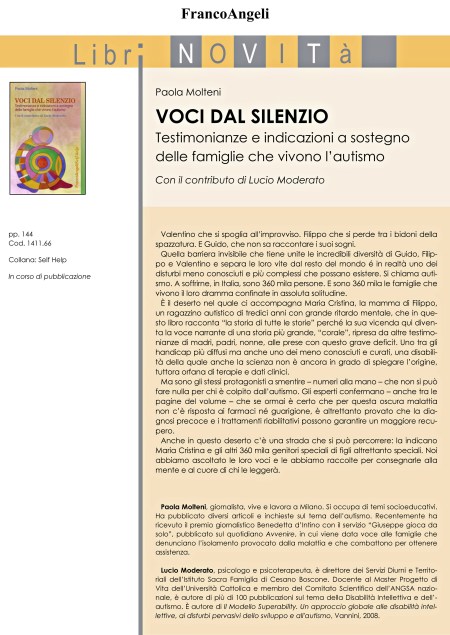 12/10/2011La ormai vasta produzione di libri sull’autismo può essere suddivisa in due grandi filoni: i libri scritti dagli esperti (scienziati, educatori, psicologi ecc.) e quelli di testimonianza (da parte di un genitore o anche di una persona con autismo). Anche se è ricca di testimonianze, l’opera di Paola Molteni non rientra propriamente in queste due categorie. Infatti l’autrice di Voci dal silenzio non è né un’esperta di autismo né un familiare, bensì una giornalista, che vuole conoscere il fenomeno autismo e contribuire, con una sorta di indagine, di viaggio conoscitivo, a dare voce a chi ne ha poca o nessuna. Dal punto di vista della divulgazione scientifica, la Molteni si è valsa di un contributo sostanzioso di Lucio Moderato, che spiega, in modo chiaro e ben comprensibile anche a chi ne sa poco, quel che oggi la scienza ci può dire sulla sindrome e sui modi corretti per trattarla. La parte più ampia del libro è dedicata alle voci di alcuni genitori e gruppi di genitori, che possono parlare in luogo dei loro figli, che voce non hanno. E bene ha fatto Paola Molteni ad aprire le sue pagine con una lettera, vibrante e drammatica, con la quale Maria Cristina, la mamma di Filippo, espone la situazione della sua famiglia, nella quale un gran numero di famiglie di persone con autismo potranno perfettamente riconoscersi. Il pensiero che mi è continuamente presente è questo: tutti i politici che si occupano di sanità e welfare dovrebbero leggere questo libro.